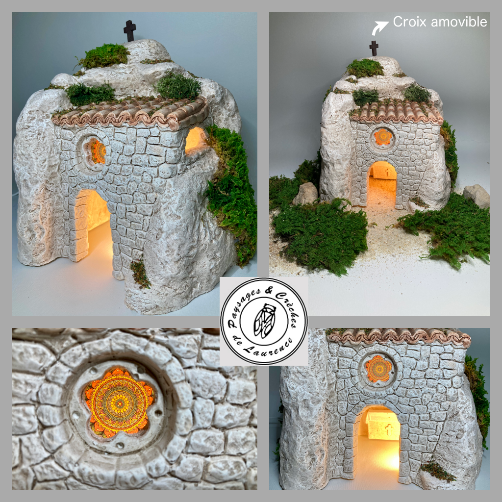 Une encoche au dos permet de faire passer un câble pour l’éclairage, l’espace intérieur permet d’y glisser un santon.